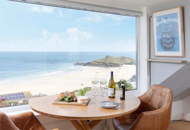 Wohn-Esszimmer Toller Blick auf Porthmeor Strand, die Tate Galerie und die Insel, Esstisch mit Stühlen, TV/DVD/iPod, Heimkino und Musiksystem, Ledersofabett, Brettspielschrank.
